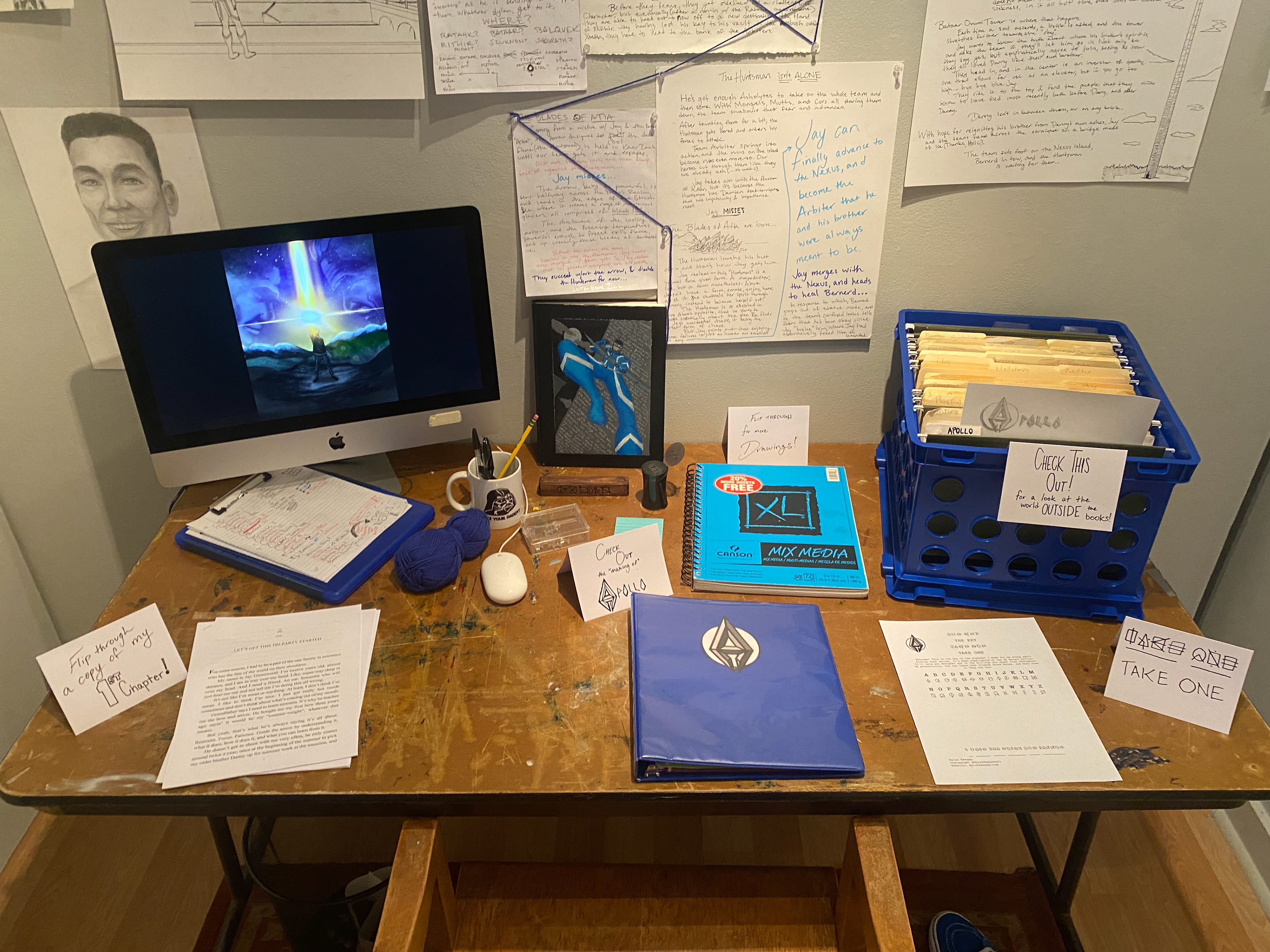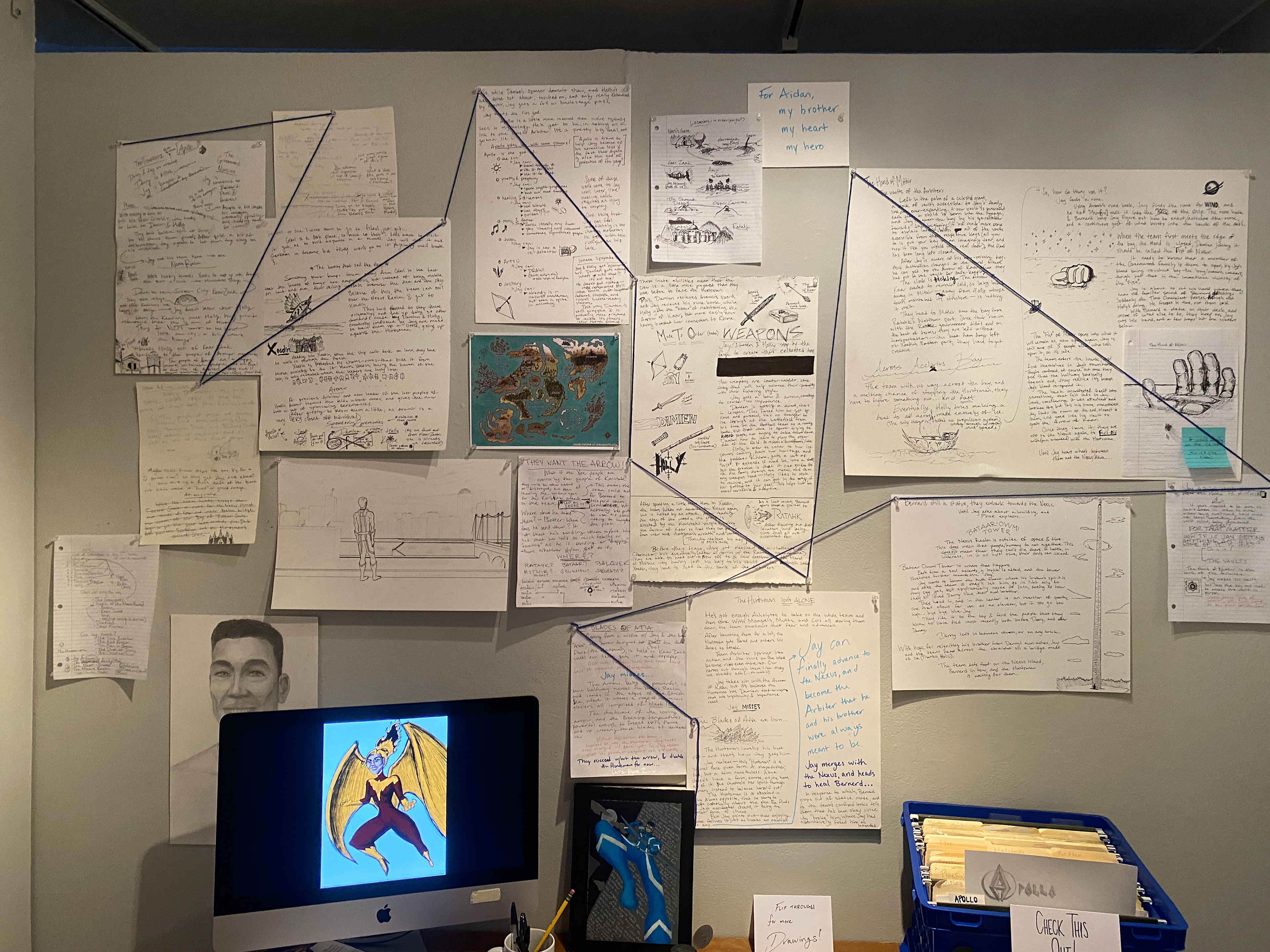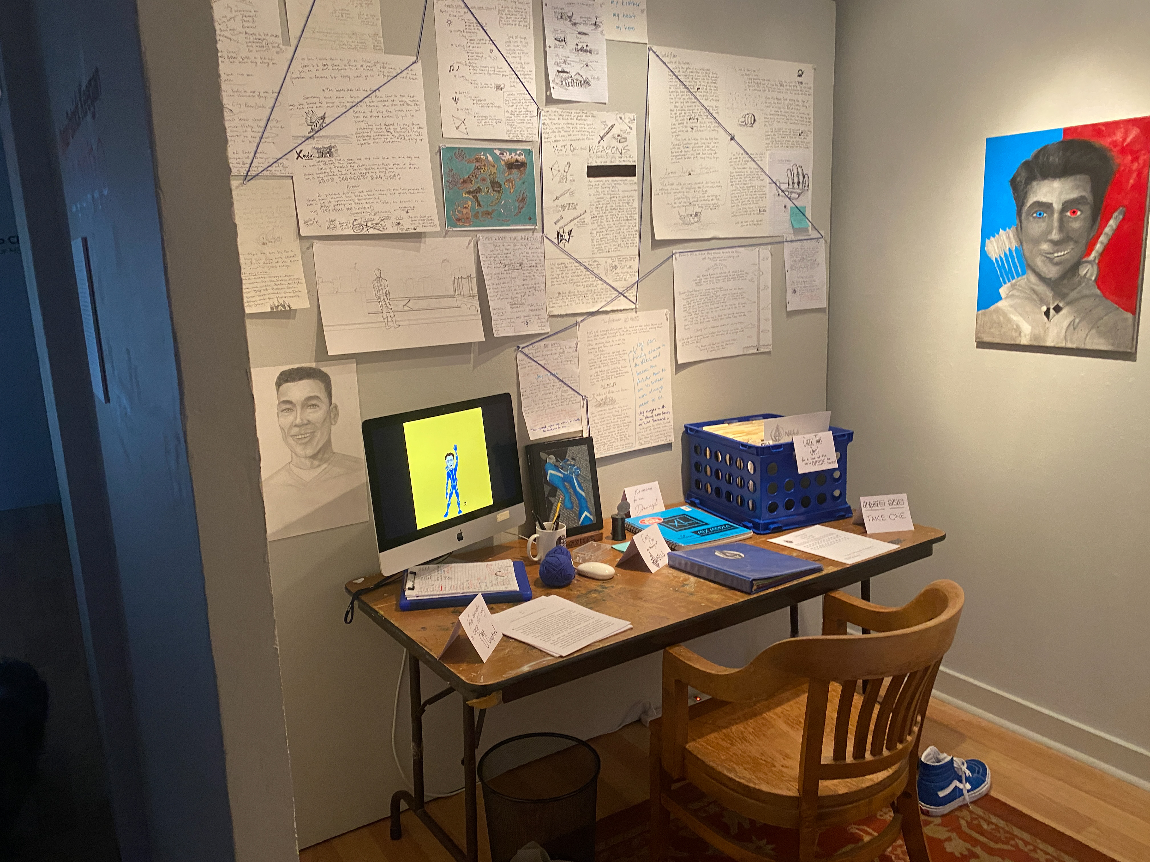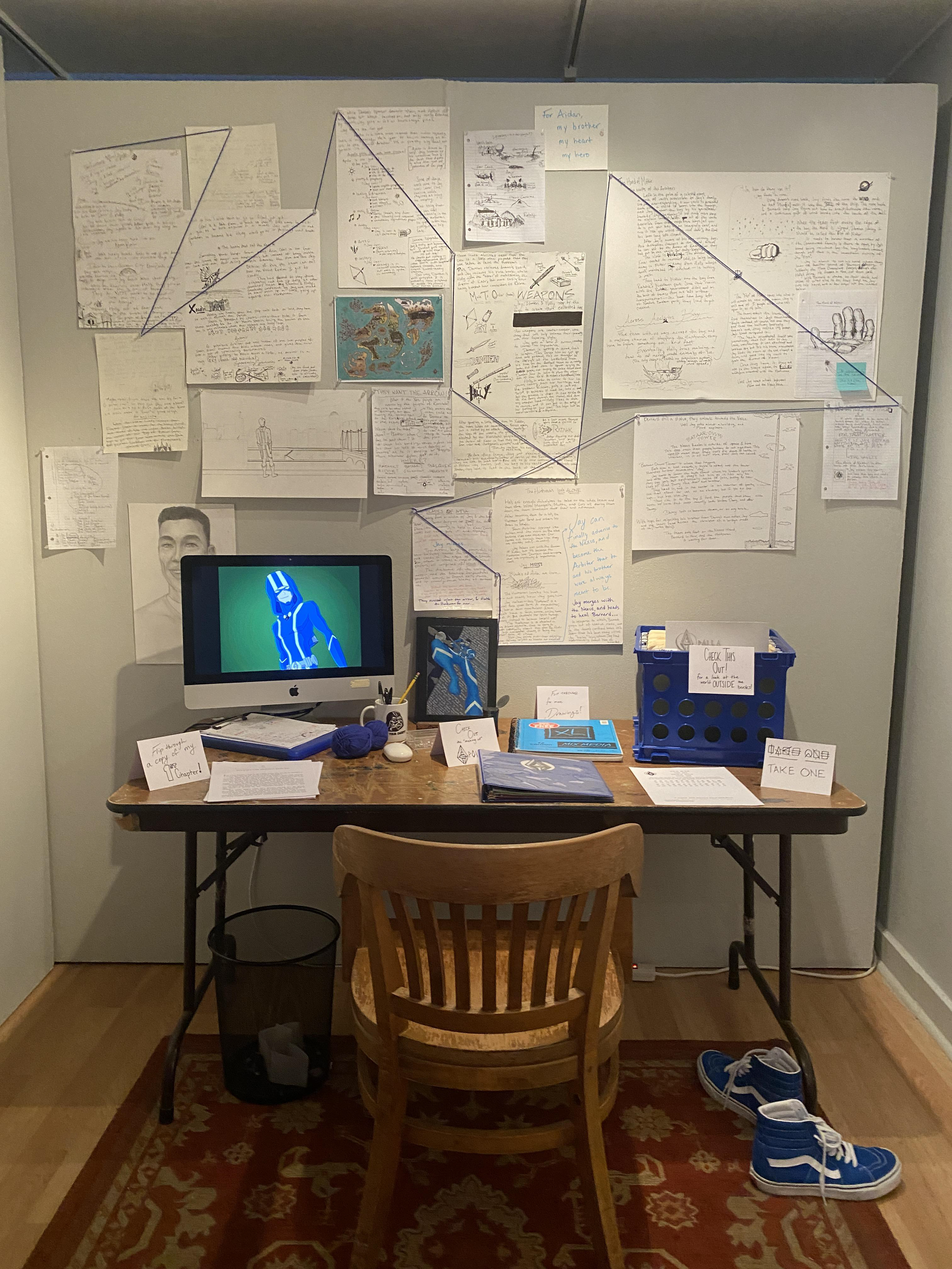 This includes a map of the world, a path of the plot, and a plethora of character info spanning hundreds of characters. There were multiple sketchbooks, quite a few manilla folders, and a main character binder that visitors were free to flip through.