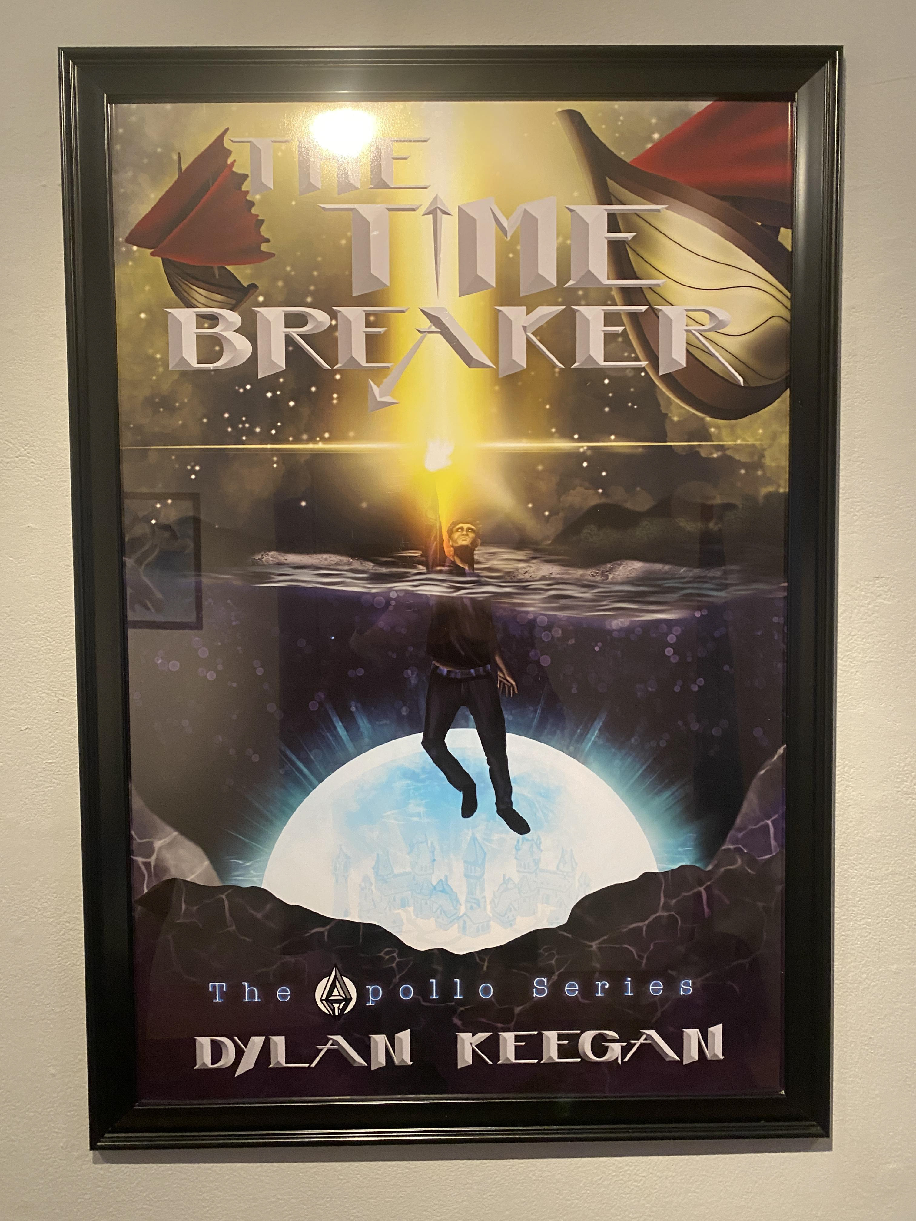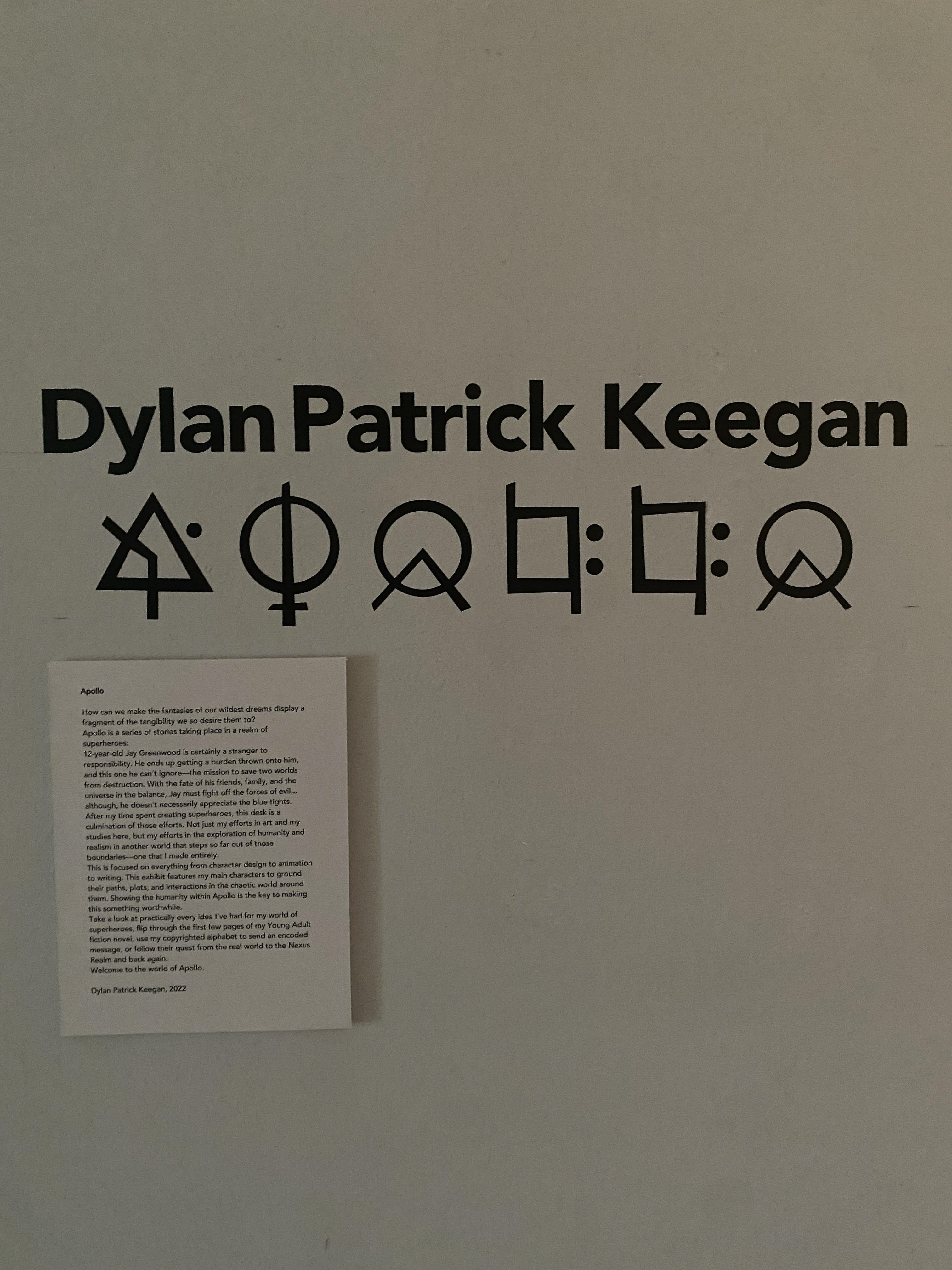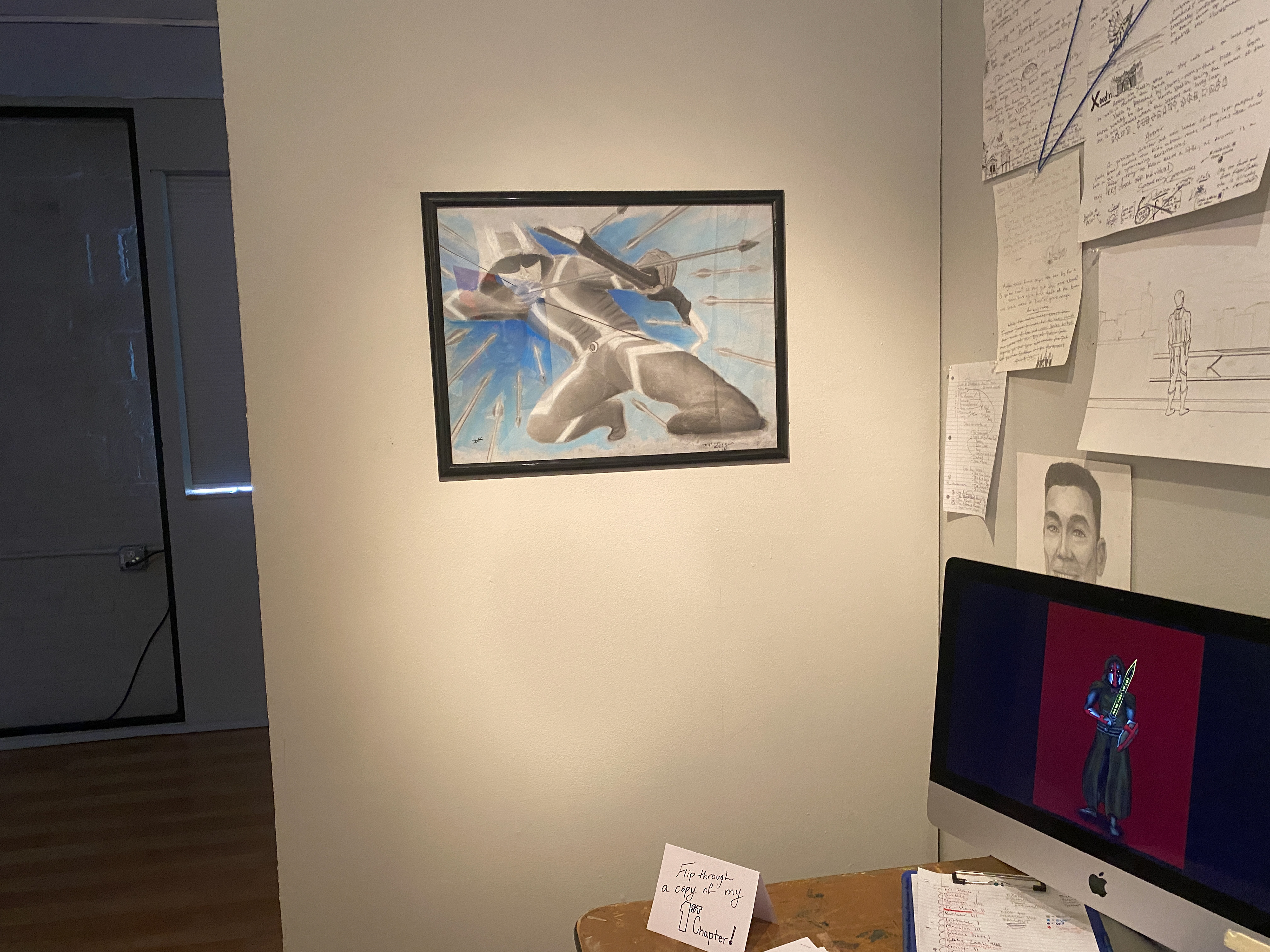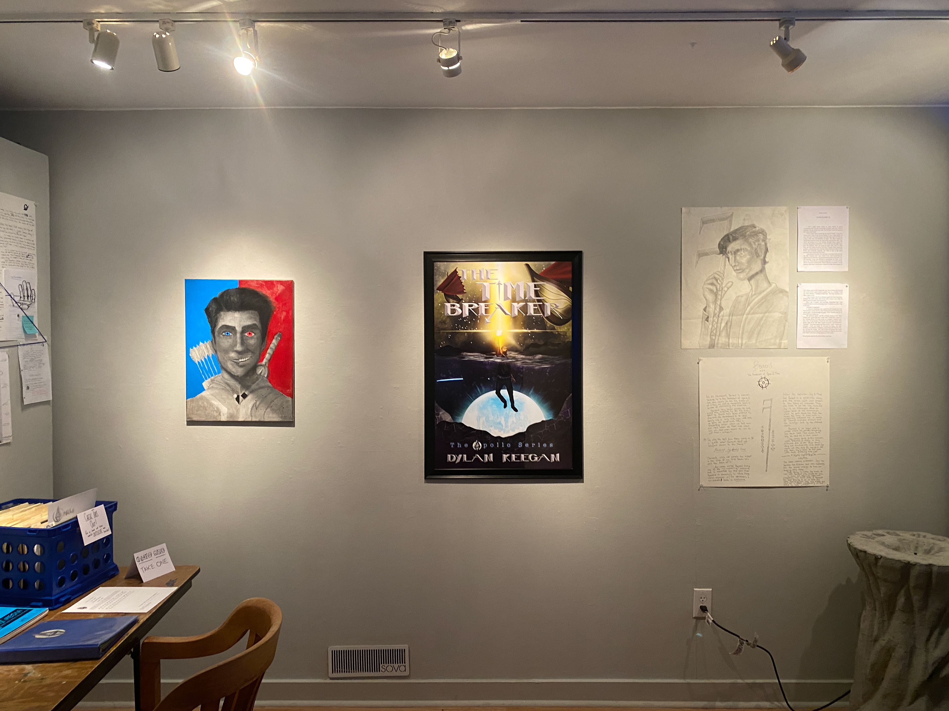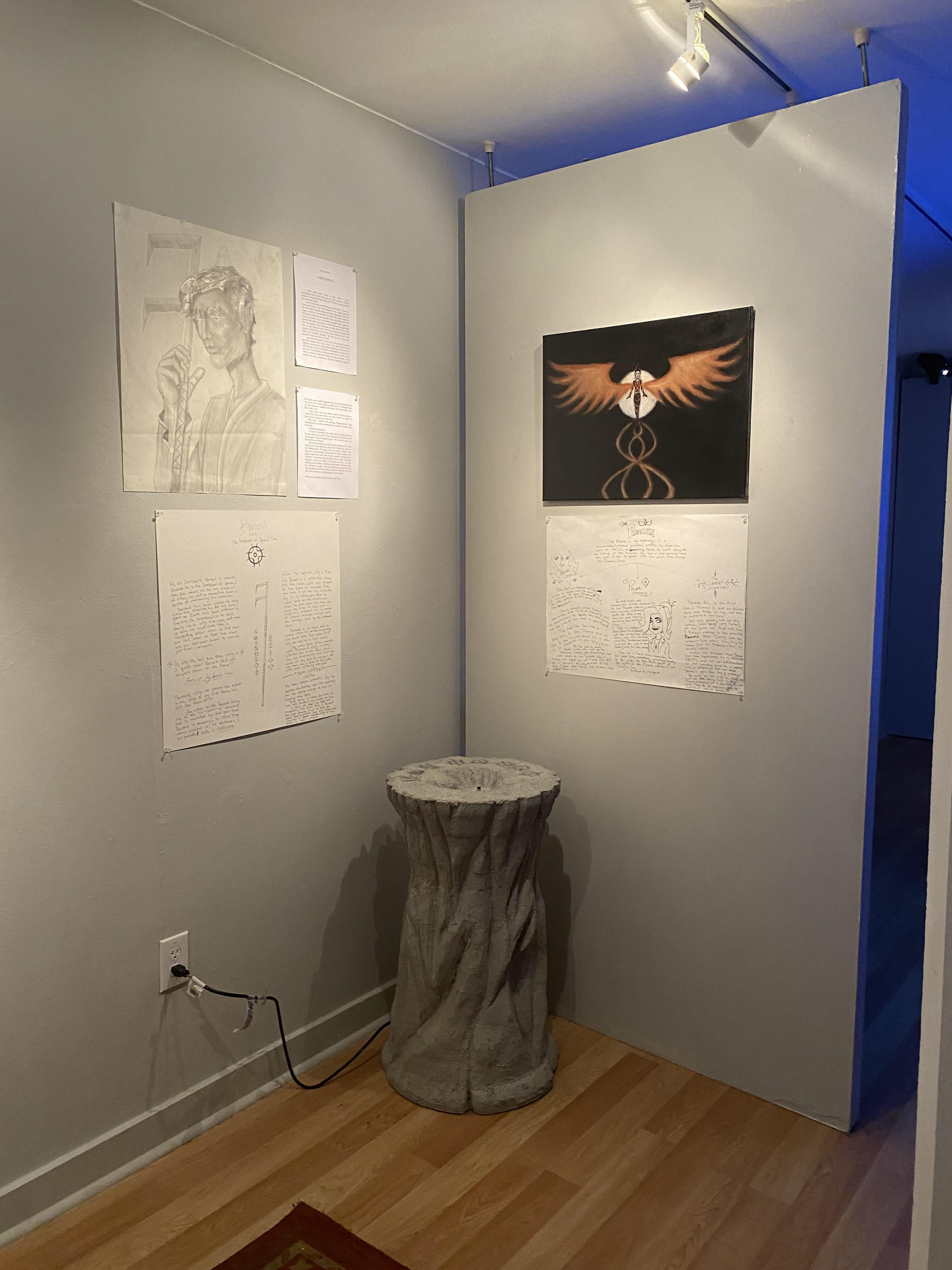 Entering the exhibit, you are greeted by the poster-sized book cover of the first novel I have planned in my series. On the left is a portrait I did of Jay and the duality of his family's responsibilities. On the right are the portrait, background and prologue from the perspective of my god of time.