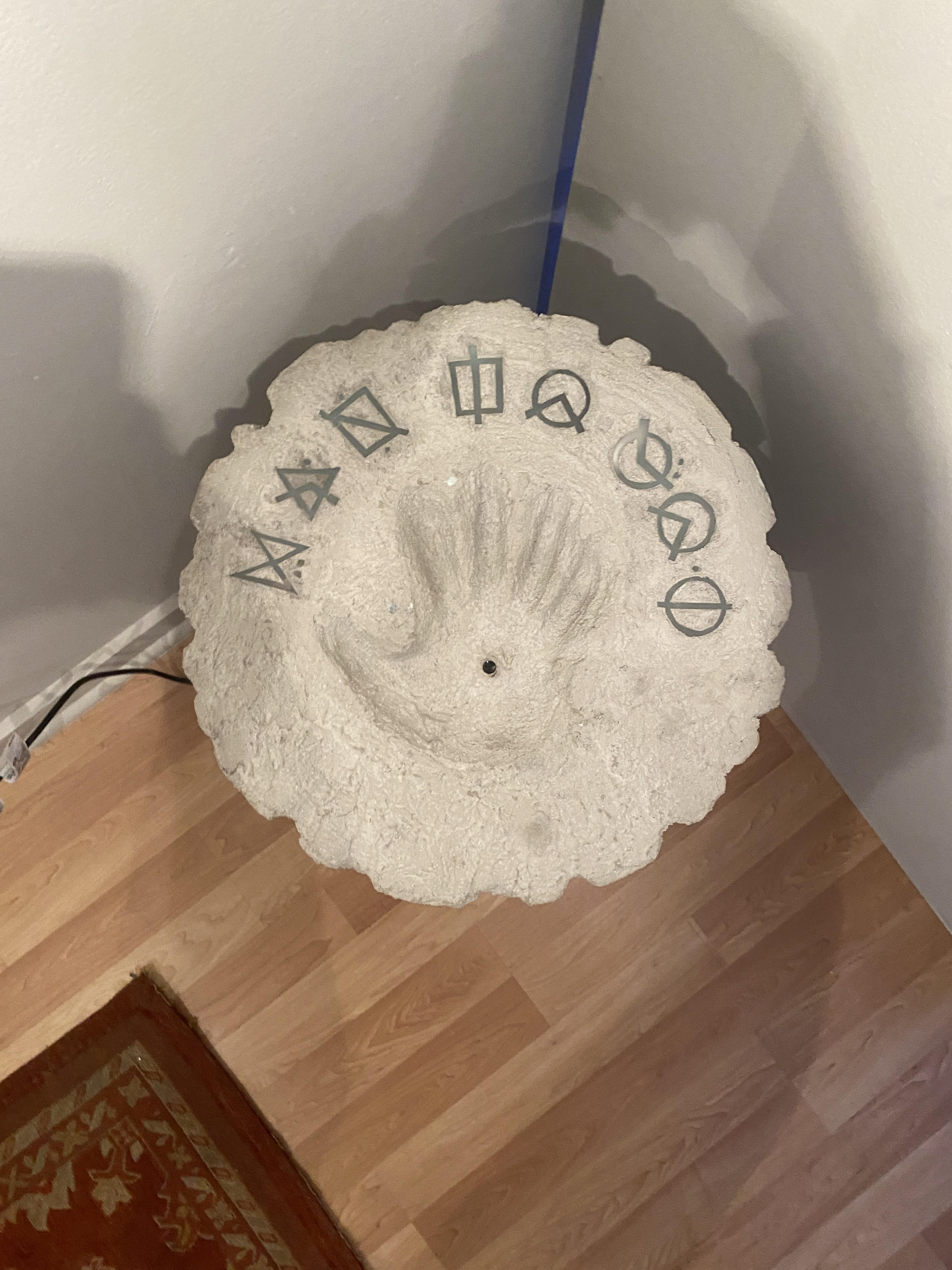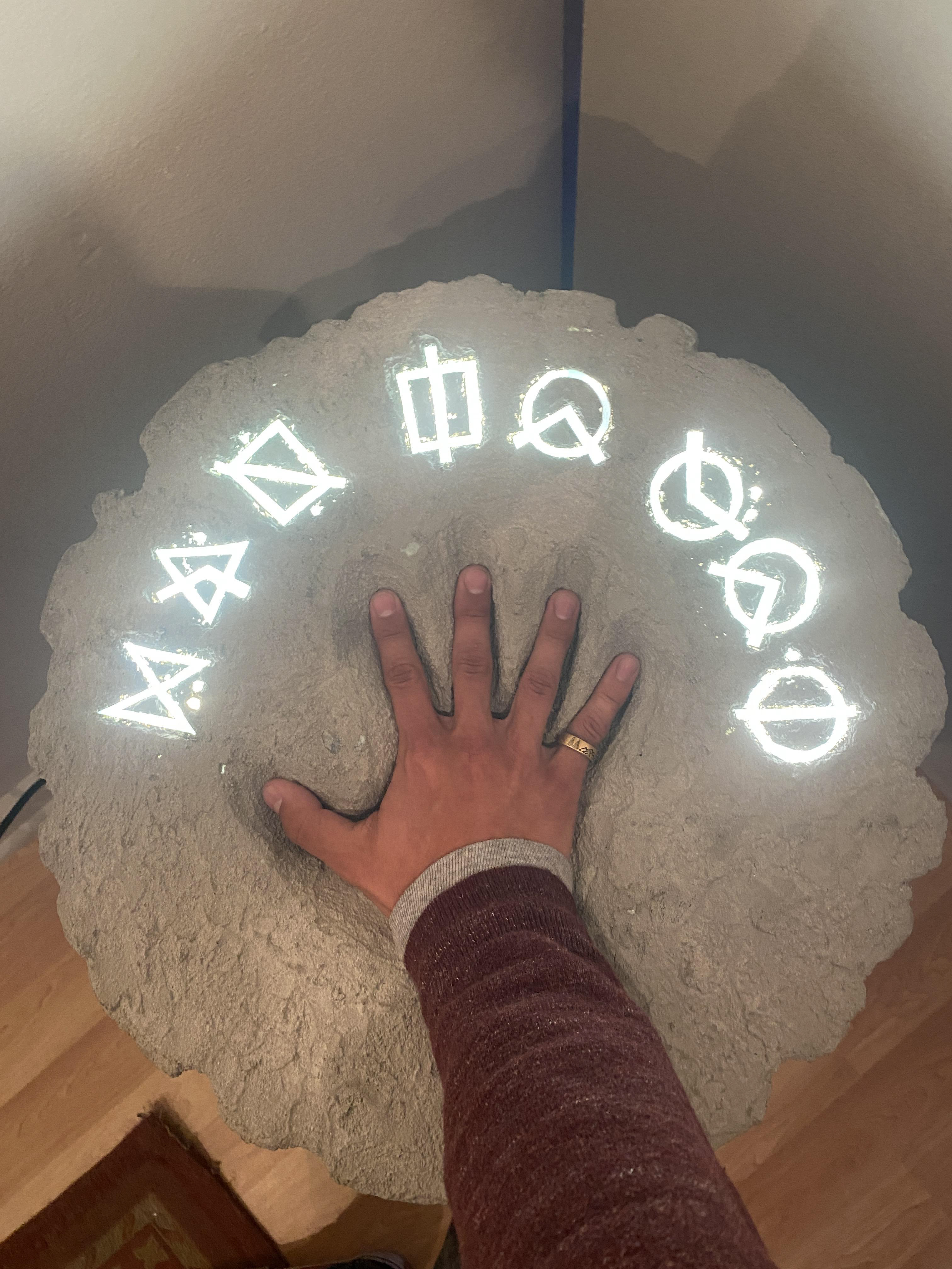 This was a project in sculpture where we were able to create whatever we desired out of foam, so I decided to manifest the gateway to my 'other world'. The text illuminated (which reads: "MAN TO GOD" in my alphabet) was done through the connection of a momentary switch and LEDs beneath a frosted piece of plexiglass. Once I had everything squared away, I covered the piece in a cement mix.